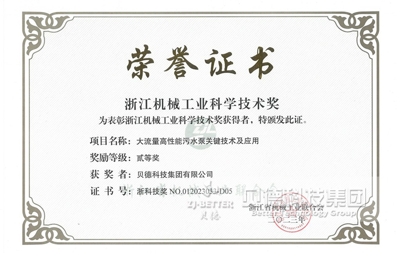 項(xiàng),貝德科技集團(tuán)有限公司憑借“大流量高性能污水泵關(guān)鍵技術(shù)及應(yīng)用”項(xiàng)目榮獲二等獎(jiǎng)。